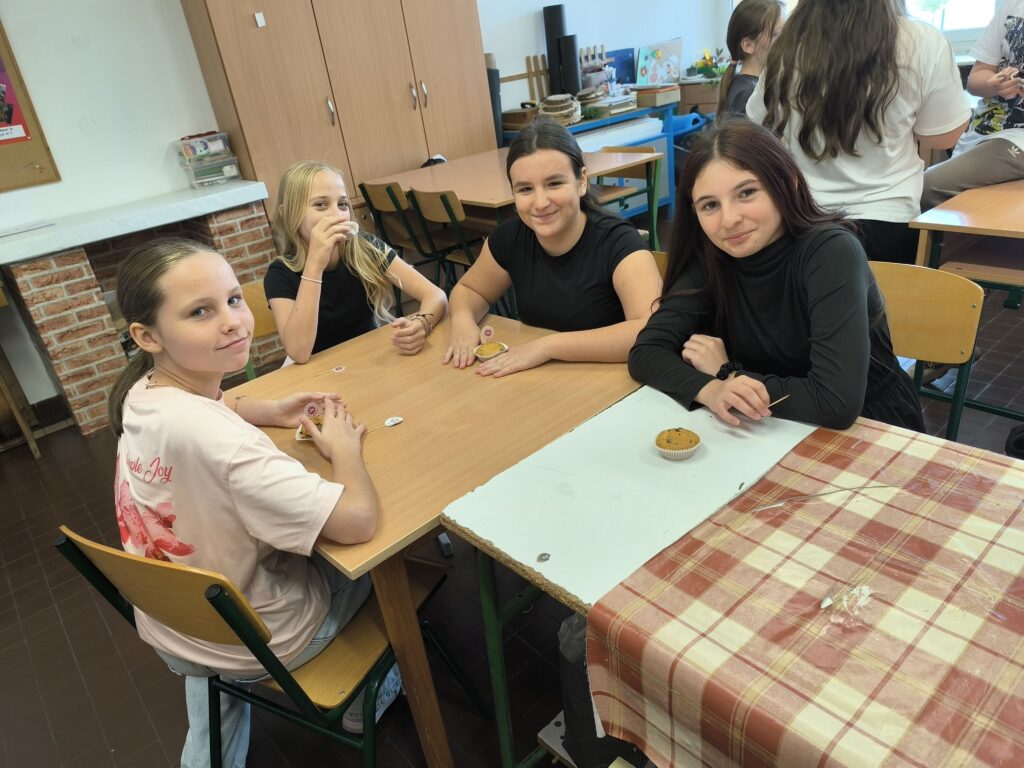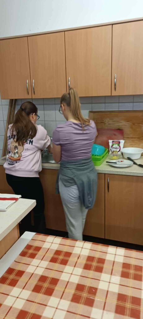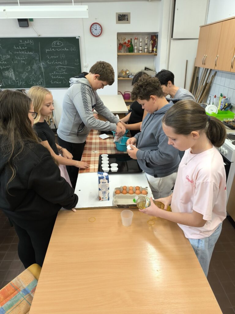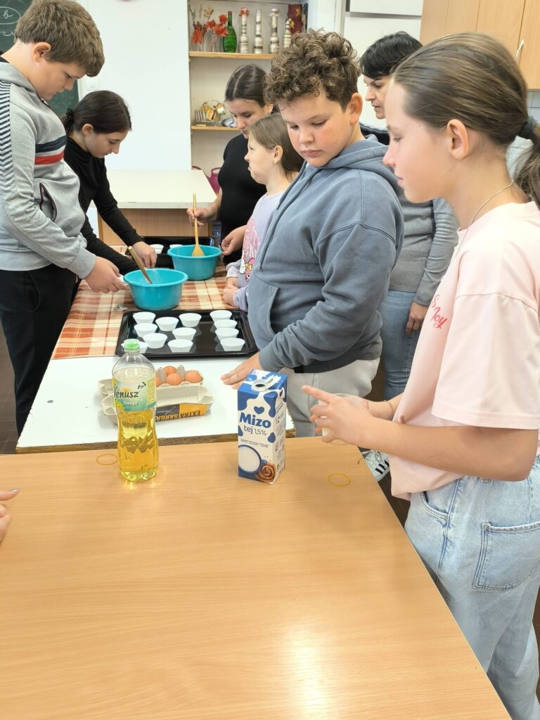 Az iskola lány-technika termében Rozs Viki néni, szakácsnő várta őket. Viki néni segítségével süteményt készítettek. A szakácsnő felhívta a figyelmüket arra, hogy a konyhában nagyon fontos a tisztaság, ezért mindenki alaposan kezet mosott. Először is megismerték a szükséges eszközöket és alapanyagokat. Gyakorolták a konyhai mérleg és a mérőpohár használatát. Megismerték a receptek felépítését is. A sütemény bekeverés után a sütőbe került. Amíg sült, a csapat aktívabb tagjai teát, kakaót főztek. Aki nem fért hozzá a munkához, az interneten gyűjtött érdekes nevű süteményeket.